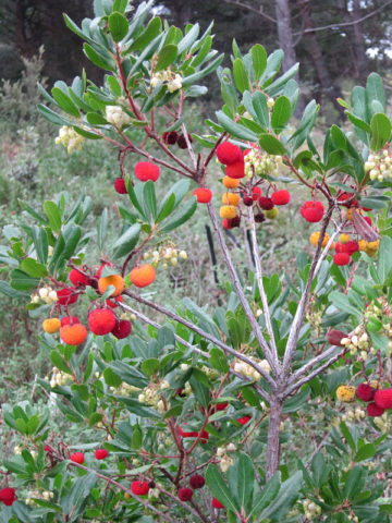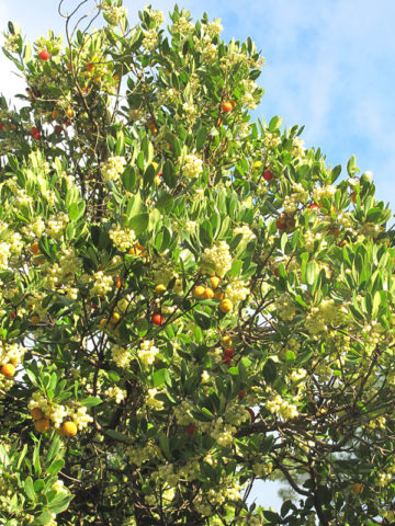 Fruit and flowers simultaneously during the winter! Strawberry Tree spreads quite wide as it grows taller and produces dense shade, making it ideal for use as a small shade, screen,or urban patio tree. Growth rate is slow so trees over 20 feet tall are rare.