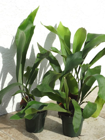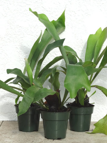 Compact fuzzy leaves like Moose horns, the mid-sized Netherlands Staghorn, is popular in So. Cal and is the perfect plant for the beginning tropical gardener. Ephyphites by nature, this unique fern is happy in the dappled sunlight of the warm garden, placed in a basket on a fence or tree. Overall this is by far the easiest Staghorn to grown and adapts to a wide range of conditions.