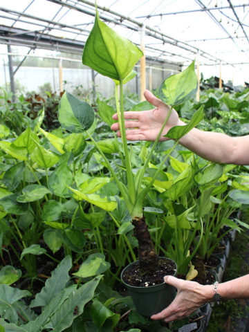 Before leaving, Cucullata Banana Split Alocasia plants are inspected, watered, and pruned. Larger plants, generally those that ship in 8″ pots or with totems, will be topped to 36″ or 48″ overall, depending on the variety, if necessary to facilitate shipping. Your new plants’ pot is then bagged to ensure that the soil stays in the pot and not loose in the box. Plants are tissue or kraft paper wrapped and secured in place with natural biodegradable peanuts.