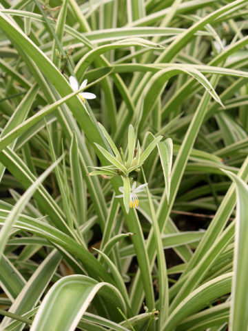 Natures air filter! Glorious tropical deep green leaves with white lined margins drape over pot edges. This clump-forming plant is quite effective in cleaning indoor air by absorbing chemicals in homes or offices. Extremely well suited for hanging pots but equally has happy sitting on a window sill or used as a perennial ground cover.