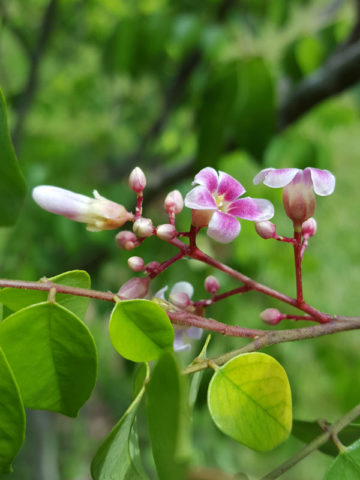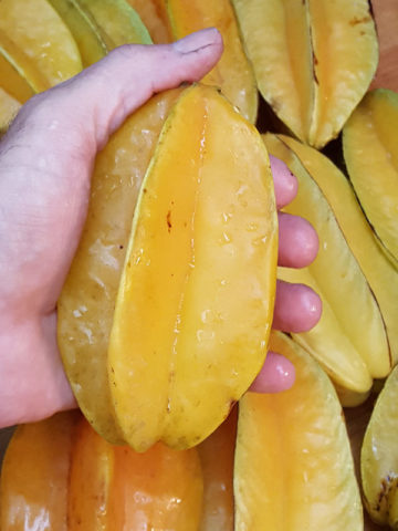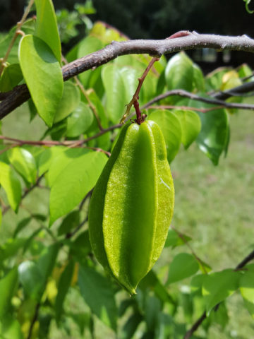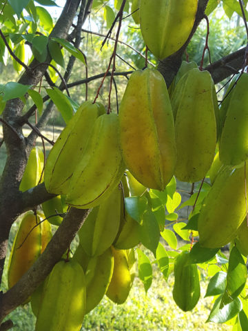 Sweet Star Fruit, Carambola is a short trunked tree with broad bushy numerous branches. The leaves are medium-green, oval shaped, long and smooth on top and fuzzy below. Leaflets are sensitive to light and harsh movement and are prone to fold together when disturbed abruptly. Red stalked, abundant, delicate lilac flowers appear in a showy display followed by hundreds of uniquely shaped oblong, heavily 5 lobed fruit.